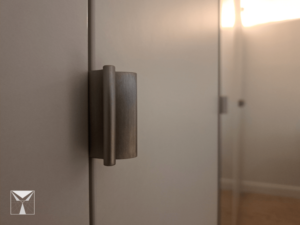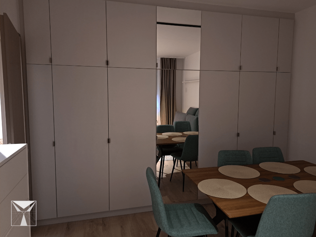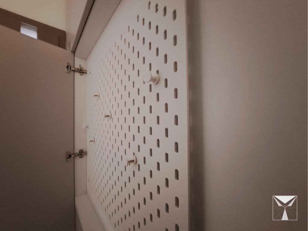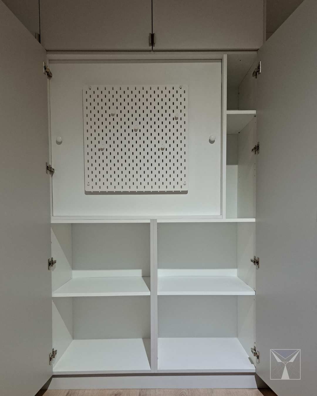 Maximális helykihasználás. Ez volt a mottója a megrendelőnek, aki a konkrét terveket is elkészítette. Egy átlagos panellakásba kellett olyan bútorokat készíteni, hogy a lehető legtöbb tárolóhely legyen a végeredmény. Az egyik legnagyobb kihívás az volt, hogy úgy rejtsünk el egy tűzcsapszekrényt, hogy a bútornak megmaradjon a funkciója. Ez az előtte-utána képen is jól látszik. A szekrény úgy lett kialakítva, hogy a tűzcsaphoz bármikor egy mozdulattal hozzá lehessen férni, a megmaradt, nem túl bőséges helyen pedig a kendőket, sálakat, öveket lehessen tárolni. Az ajtók csillapított csukódásúak, ahogyan a belső fiókok is fékesek.