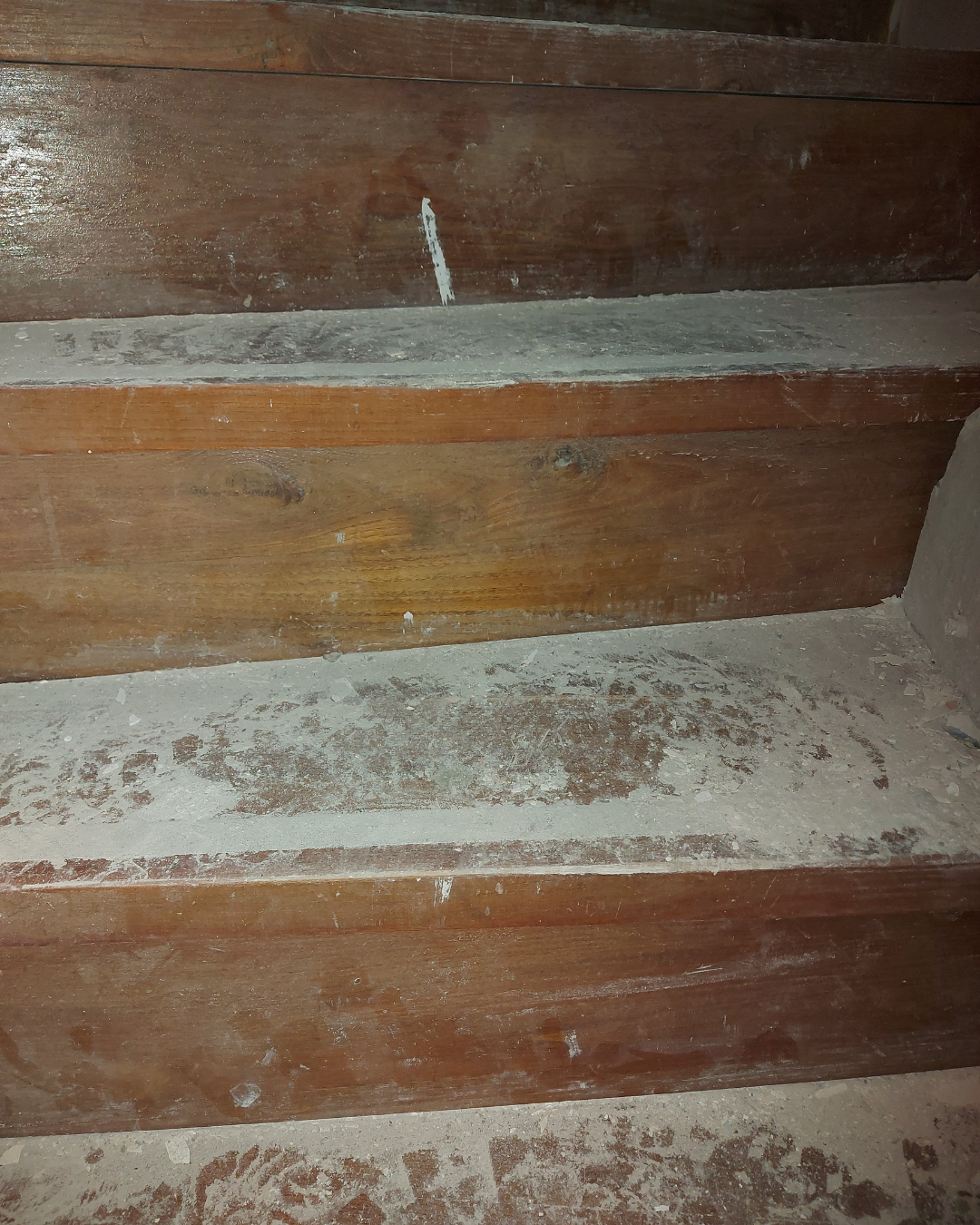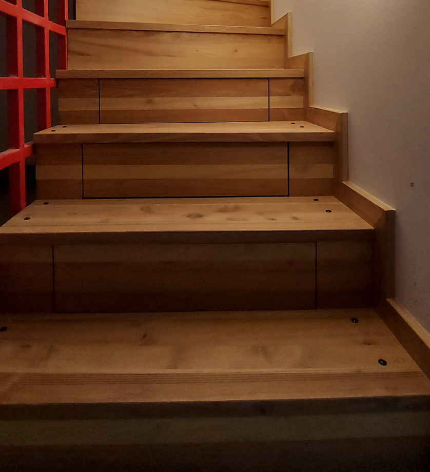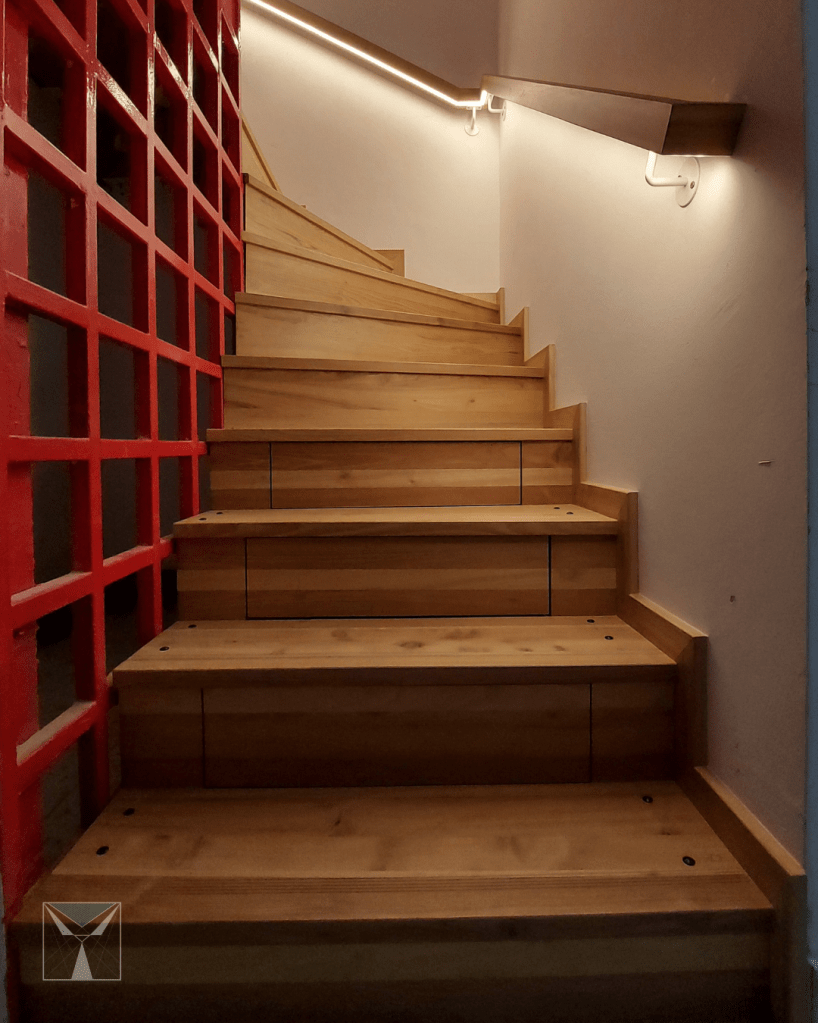 Egy évtizedek óta használt akácfalépcső újult meg. Az eredeti lépcső jelentős része menthető volt, de szinte mindegyik lapot ki kellett egészíteni. A lapok csúszásgátló bordát is kaptak, ezután jöhetett a csiszolás és a lakkozás. A megrendelő kérésére három fiókot is beépítettem, mindegyik PUSH-OPEN rendszerű. Eredetileg nem volt szegőléc, ezt most pótoltuk.